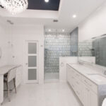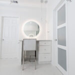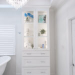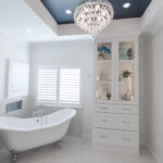 Some of the key changes made all the difference—expanding the shower, installing a freestanding tub, and adding a custom armoire that gave the room both beauty and function. But what really made this bathroom shine were the details: a dark-painted ceiling paired with bright white finishes, a chandelier that softened the entire space, and one of my favorite additions—a light-filled makeup corner that feels both practical and luxurious.